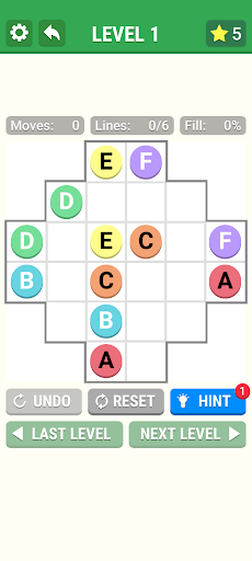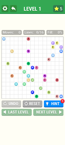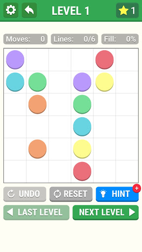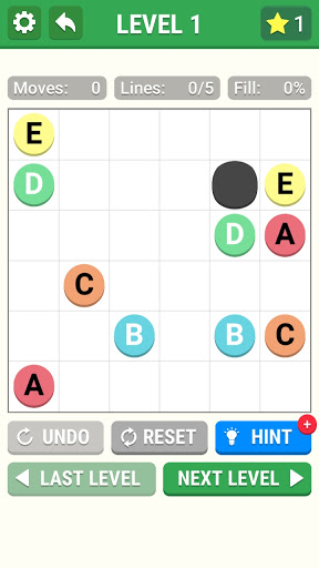 The objective is to connect dots of the same color by drawing 'pipes' between them such that the entire grid is occupied by pipes. However, pipes must not intersect. Difficulty is determined by the size of the grid, ranging from 5x5 to 15x15 squares, rectange and special shap.