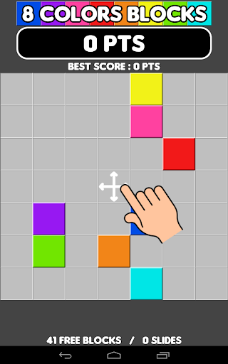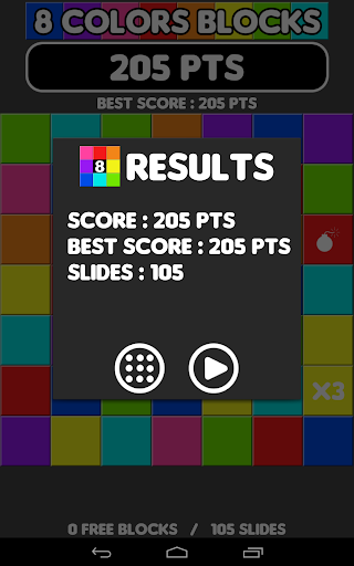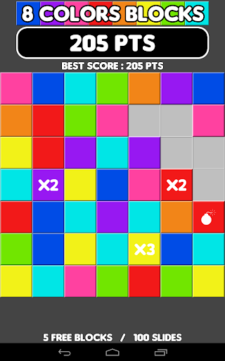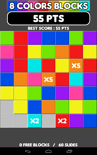 In "8 Colors Blocks", you have to slide blocks of 8 different colors up, down, left or right to create groups of blocks with the same color (as in match-3 games). Tap on groups of at least 3 blocks of the same color to score points. The larger the group, the more points are scored. Use bonus blocks to increase your score and show who is the best with "8 Colors Blocks".