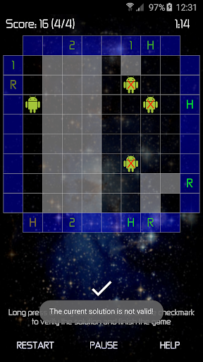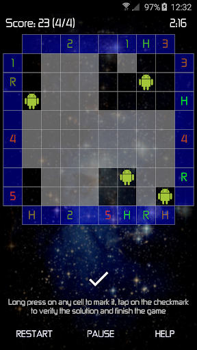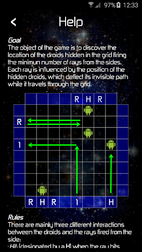 This game is similar to the famous Black Box puzzle game, you have to figure out the positions of the hidden droids depending on the paths of the rays in the grid.