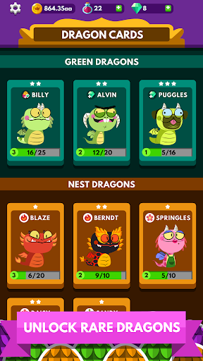 Join in the idle games fun where you collect cards and dragons to generate money. Your adventure is an idle game meaning that you can keep generating gold even when you're not playing! Return to your Kingdom when you're ready to hatch new dragon eggs and unlock even more nests.