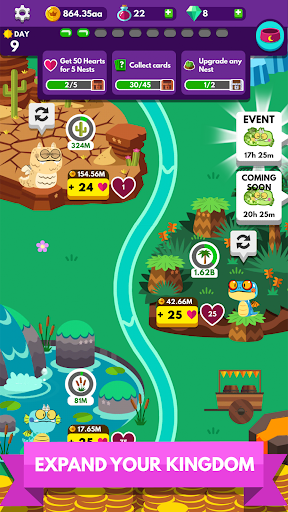 Play through each level of gameplay to unlock more lands and exotic habitats in your idle kingdom. Dragons live on their nests where they make gold coins. Tap to fill up your nests and make them produce even more coins, until you are making bajillions of coins per second. Upgrade your Dragons and their nests by collecting cards and magic potions. Use magic potions to level-up your favourite dragons and increase their money-making abilities even further.