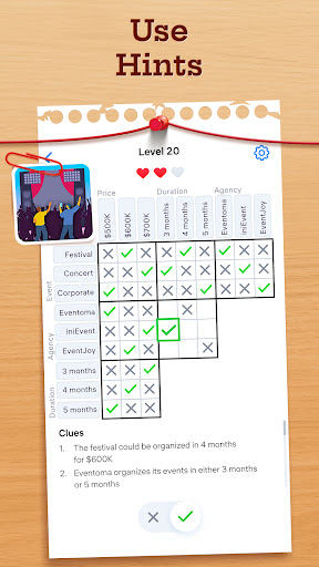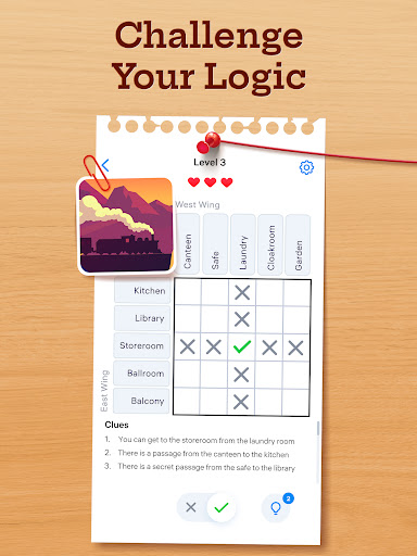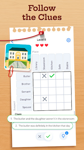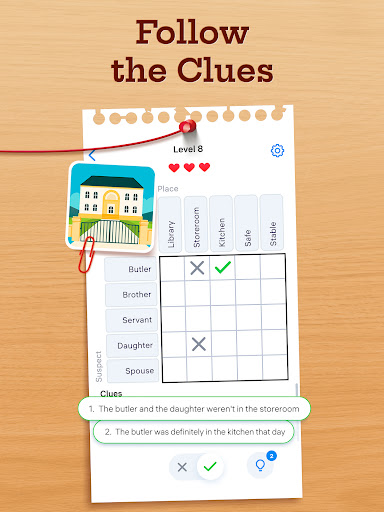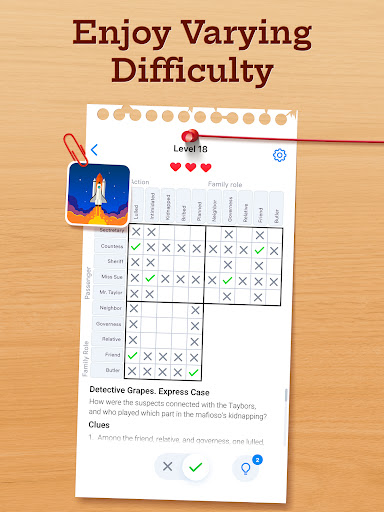 This fun yet challenging brain puzzle game with simple rules may help to strengthen logical thinking and deductive reasoning. Try to solve all the smart riddles grouped into thematic stories that are sure to delight in this one of the most exciting brain games. Help Detective Grapes investigate a necklace theft, participate in vacation planning for a young couple, or even go on a space expedition. You will find many mind-bending stories with varied plots and tricky solutions. If you are interested in solving logic problems, play this engaging brain game and have hours of fun!