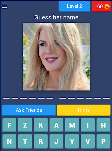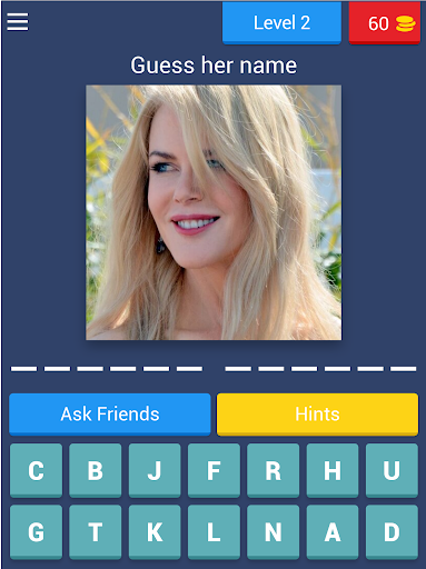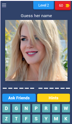 This Funny Game requires the player to Guess The actor or Actress name, and write the letters of the name correctly to gain the coins and pass levels, it includes 51 levels, with new constant levels added every period of time, this Game helps you improve your memory and spelling skills with Fun.