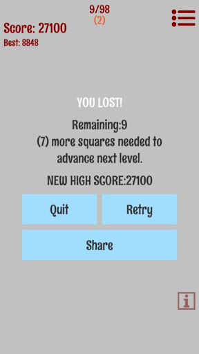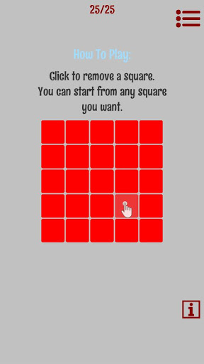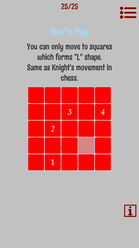 Try to remove all of the squares by jumping from one to another. There is one rule! You can only jump to squares which forms "L" shape. Like a knight in chess. Play through 28 unique levels or compete with your friends in infinite level.