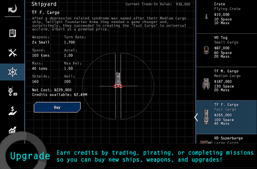 Spend your credits on new ships, weapons, and upgrades! Which style of ship suits you best - Cargo ship? Warship? Slow and sturdy or quick and agile? Will you use all your ships mass points for upgrades or max out your weapons? So many options! .... how will you choose to play?