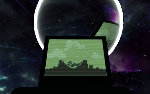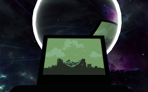 Covering for a colleague taking a bathroom break, you find yourself in front of a mysterious console with a green screen monitor showing a pixelated live image of an unknown city. Also present is an ominous red button with the simple instruction to not touch anything!