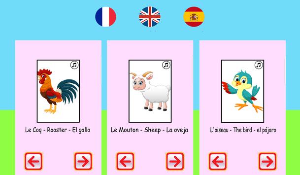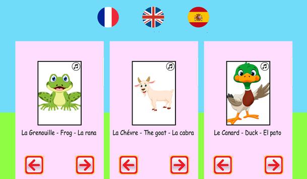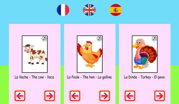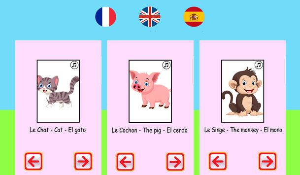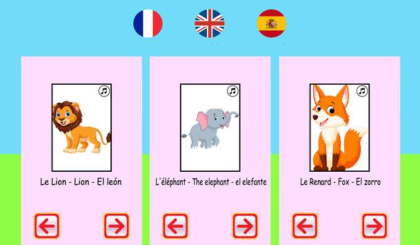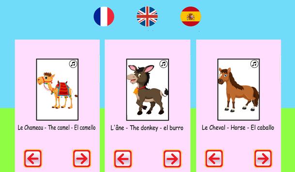 To learn the shout of dog, goat, the cow, the turkey, the frog, the duck, the horse, the sheep, the elephant, the monkey, the donkey, the bird, the cat(chat), the hen, the camel, the cock, the lion, the owl, the pig, the fox and the crow and full list of animals are present in this application which will help your baby to develop his vocabulary and to improve its language.