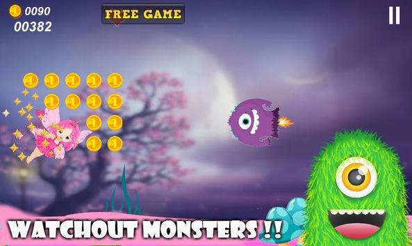 The cute little girl is flying through fairy land in search of gold coins and treasure. This is beautiful fairy tale game of a princess who lives in wonderland. She lives with her prince in very big castle. One day the beautiful fairyland was hit by the scary monster who came to invade the cute little princess, he was sent by evil queen to kill the princess. The queen did not like the girl at all she always thought of new ideas and ways to see her dead.