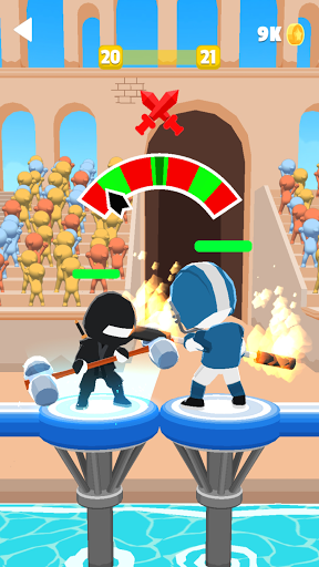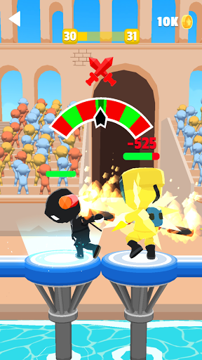 At the moment, there are three game locations available – a sports arena, a platform on the moon, and a colosseum. There are 15 levels at each of them. Once a level is completed, the number of enemies increases. Note that the boss appears in levels 5 and 15. The ability to earn coins from defeated enemies is a good bonus. In-game currency can be used to upgrade your character – damage or health. Besides, the user can purchase a new skin or weapons, which are provided for 9 pieces. You can also earn coins or upgrade your character by watching ads.