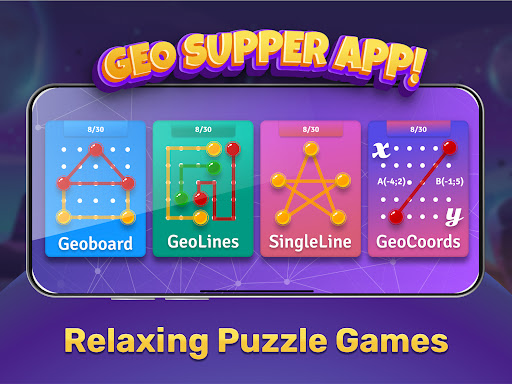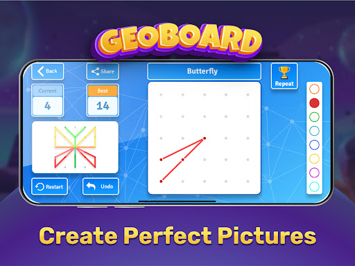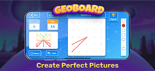 Geoboard is an excellent puzzle game for kids and adults to use geoboard and develop their attention, logic, coordination and mathematical thinking. We were inspired to create this game by physical analogue of the geoboard game that pupils of 1st grade use to learn creativity, colors and mathematical thinking. Geoboard game is half mathematical and half artistic puzzle game. From mathematics you have a coordinates geoboard and sample that your kid needs to repeat by using minimum moves. From art we have a mode where you or your kid should use your imagination and creativity to create picture of the object yourself.