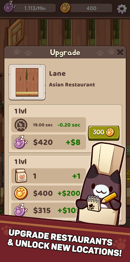 Soon you take up bigger challenged and venture out into the world, opening more restaurants at different locations, building a Cat Restaurant Empire !