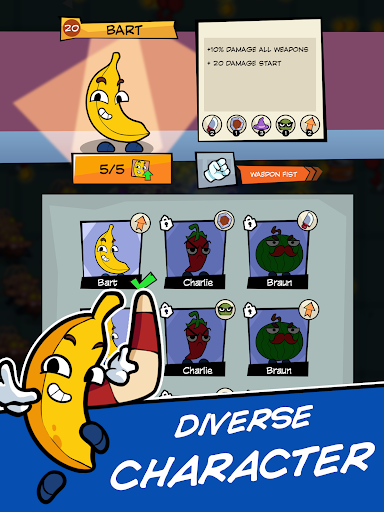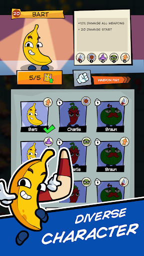 Become a hero of chivalry, survive and take the responsibility of surviving to achieve a heroic end. You will play as food characters and survive through the battle by killing all vermin. Red pepper - Charlie survivor, Pumpkin - Jack survivor, Banana - Bart survivor, Brotato Bob survivor, ... Each character has different powers and strengths, choose a favorite character for yourself and destroy zombie enemies with powerful weapons in your survival fight.