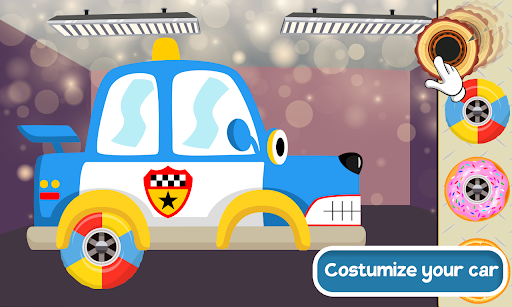 The kid can also customize his favorite car/vehicle using a rich set of wheels, bodies, lamps, and other car pieces.