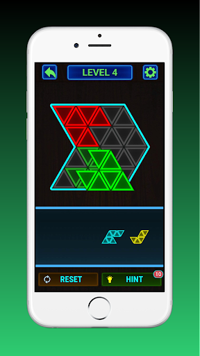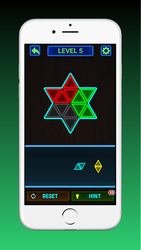 Place all shapes made from glowing triangle blocks on the board without overlapping. Each board in each level is attractively designed so as not to be boring. It's interesting to play at any time of the day. You can even play with friends or family in your spare time.