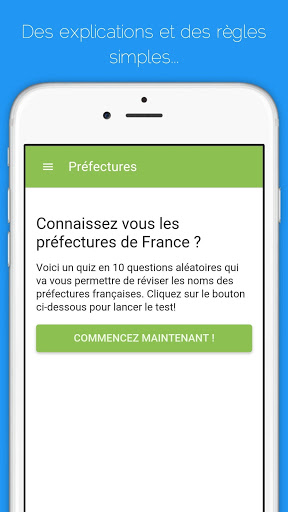 L'application génère aléatoirement des quiz et des tests géographiques. Vous pouvez jouer indéfiniment sans avoir les mêmes questions! C'est pratique et cela est extrêmement efficace pour l'apprentissage de la géographie française...Vos enfants peuvent aussi faire ces quiz, au moins ils joueront à quelques chose de ludo-éducatif!