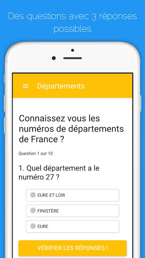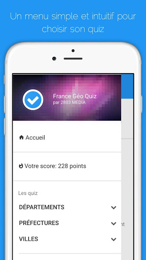 Géo Quiz France est une application qui vous permet de tester vos connaissances en géographie française et votre culture générale. Le principe est simple, vous pouvez faire plusieurs types de quiz portant par exemple sur le nom des départements, le numéro des départements, le nom des préfectures françaises ou encore sur le nombre d'habitants des villes. En fonction de vos résultats vous passez des niveaux et vous gagnez des badges!