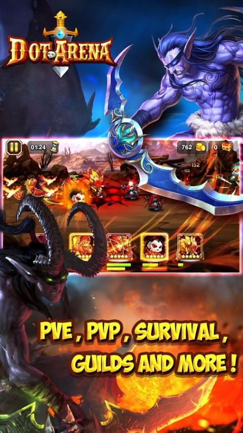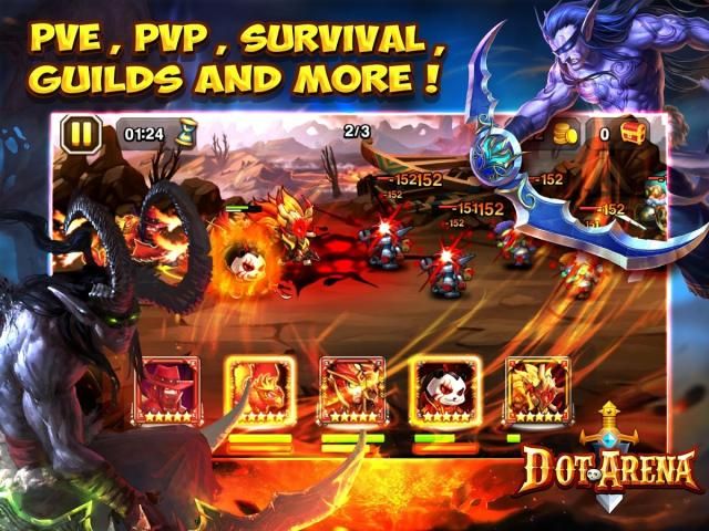 2 Adventure Unique Survival-mode PvP – Adventure through Dot Arena’s unique survival PvP mode: the Crucible of Fire. Your heroes will be eliminated once they die in battle and only the surviving heroes can enter the next CoF battle.