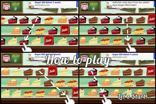 Try out your focus, pace and patience to get the highest points you can achieve by swiping the 3 same cakes on the display.