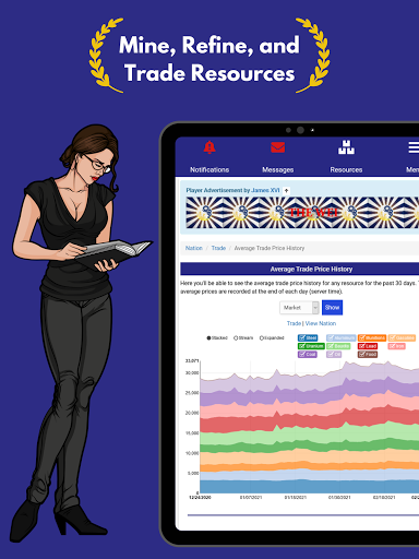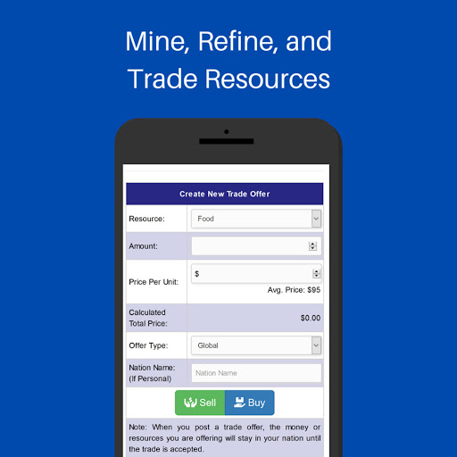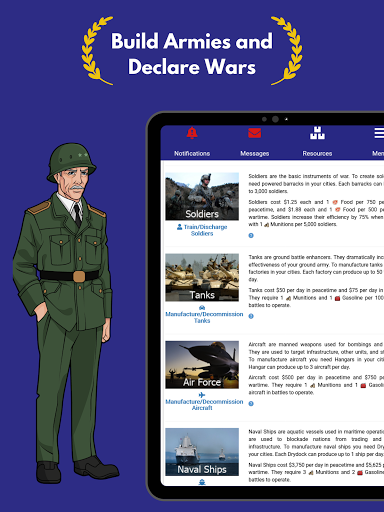 Raise armies and wage war with other players. With 7 different military units, including nuclear weapons, you can raid neighboring nations to loot money and resources or wage all out attrition war to pummel your opponents into the ground.