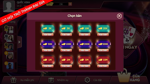 Trong Tiến lên giải trí xếp hạng, bạn có thể tham gia chọn bàn theo giá tiền, hoặc chơi ngay để tìm bàn tự do.