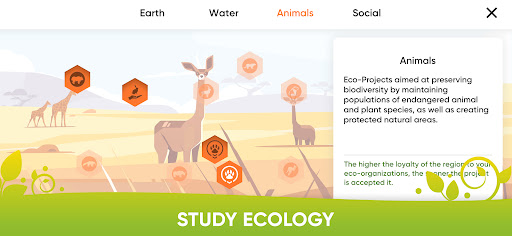The player’s goal is to stabilize ecological situation on the whole planet on early stages. And then step by step restore and improve eco-situation of the Earth. In the end of your game you will get your statistics on how successful your mission was. Each step leads to different consequences, you have to make thoughtful actions and fast.