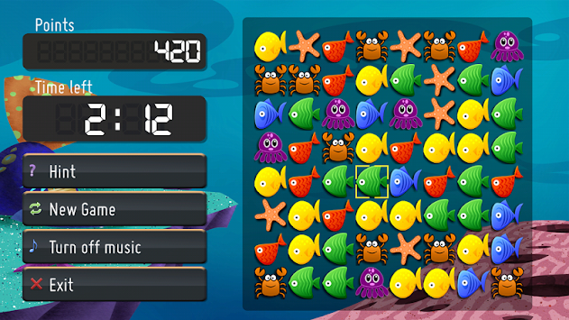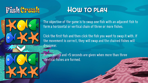 Fish Crush is a fun game for both kids and adults, The objective of the game is to swap one fish with an adjacent fish to form a horizontal or vertical chain of three or more fishes.Bonus points and 5 bonus seconds are given when more than three identical fishes are formed.
