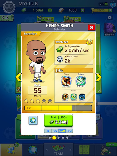 ▪ TRAIN your players and upgrade their soccer skills (shooting, passing, dribbling, defense…) to multiply their value and the money they generate