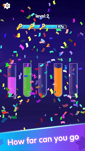 Witness an unconventional match puzzle gaming arena in which you will be required to apply skills, focus and strategy to solve the game by matching colors in as few moves as possible. Test how far you can go at juggling multiple colors, patterns and tubes in a single level at a given time.