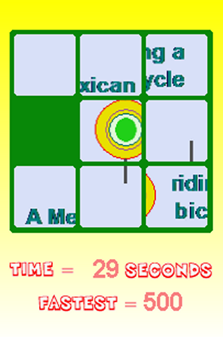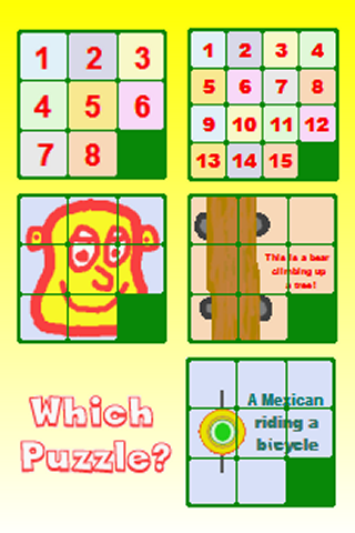 Get the fastest time on the high score table for 5 different puzzles. Slide your puzzle to create a Mexican on a bicycle or a bear climbing a tree and the standard 3x3 and 4x4 number puzzles. Enjoy my simple game. Geoff Newton.