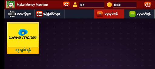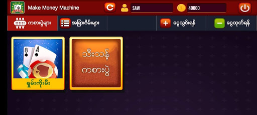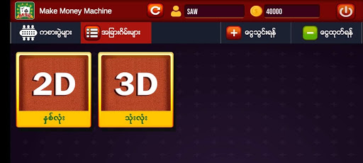 Make Money Machine is a famous game in Myanmar. There are so many games included such as shan koe mee, 2d , 3d and others. Cash-in/Cash-out can be done quickly and easily.