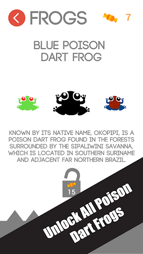 15 different skins are available for unlock using candies eaten in Classic Mode and Infinity Mode. These skins are real poisonous frogs from around the globe with significant characteristics drawn in comic style. Short description of their biography are provided.