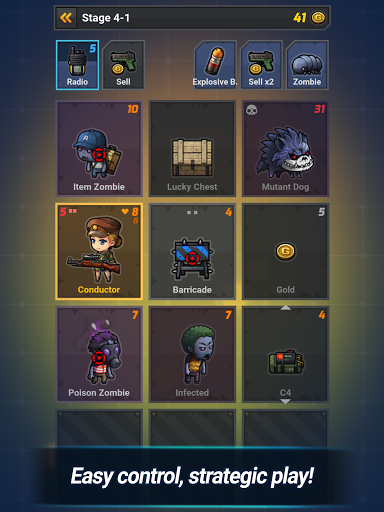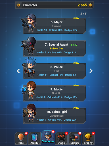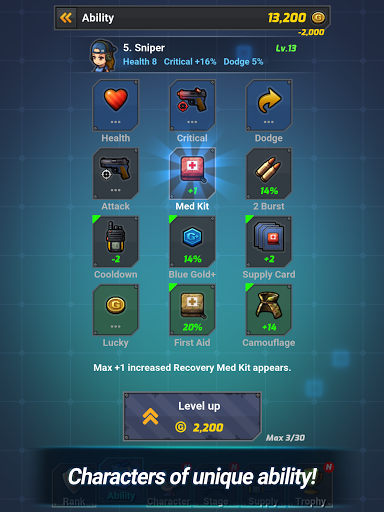 Attack enemies and barricades with weapons, character's Health, and bombs, and collect points by collecting gold while recovering character's health with Med Kits. You can acquire new stages and characters by increasing the number of points while earning supply cards. You can also unlock characters' abilities and new skill cards with gold from stages.