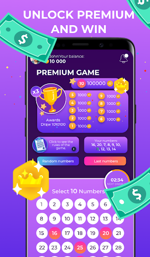 Looking for an awesome side cash money app? Match 10 out of 80 numbers, unlock special premium lottery and win REAL MONEY.