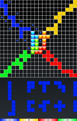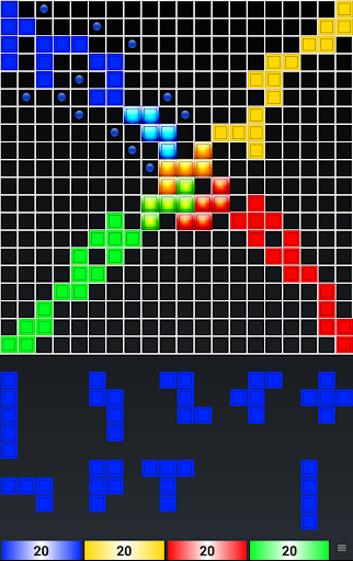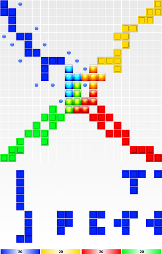 The game is played on a square board divided into 20 rows and 20 columns, for a total of 400 squares. There are a total of 84 game tiles, organized into 21 shapes in each of four colors: blue, yellow, red and green. The 21 shapes are based on free polyominoes of from one to five squares (one monomino, one domino, two trominoes/triominoes, five tetrominoes, and 12 pentominoes).