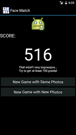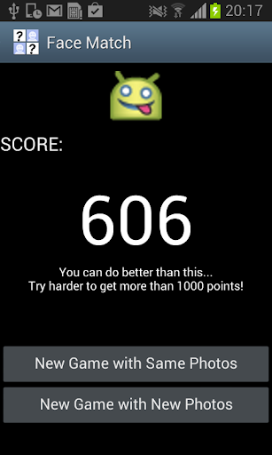 Face Match is a memory card game that uses the pictures from your contact list as cards. Make pairs of the same pictures as quick as possible and try to beat your best score!