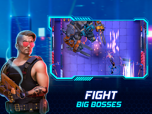 The cyberpunk game controls are intuitive and easy to learn. Tap & hold to move, stop to shoot. Remember, you have only one life for each run, so watch out and master your self-defense to win the epic roguelike game.