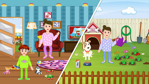 It's time to go to the my town home to buy some groceries to Pretend family house. Visit the town house daycare center to buy some kitchen food, luxury outfits for winter season, and for picnic adventures in this pretend play world pregnant mommy games. Watering the pretend play plants grows some new flowers in the lawn. Cleanup the dog house in roplay Pretend Games. Play different pretend play best games with your family, play with toy gadgets for fun in pretender among us. Display toys properly on the shelf after playing and decor room properly in antistress welcome to my house game.
