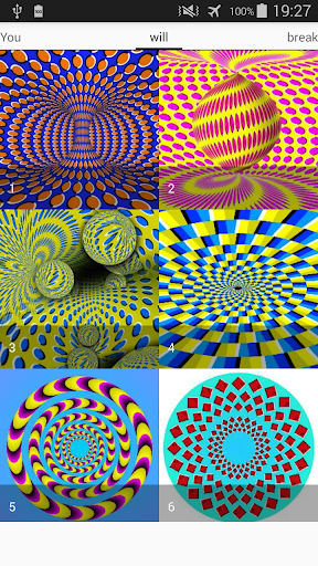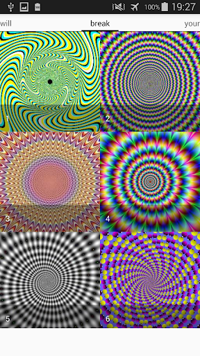 The application contains incredible illusion effects that will make your eyes and brain deceive. Try to look at the illusion you like for as long as possible and look at any object!