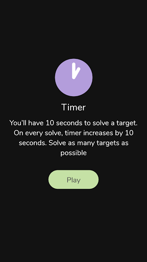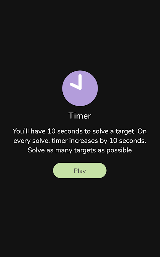 1. Timed: Can you beat the clock? You'll be given 10 seconds to solve a math target. If you solve the target within the time then you will be given 10 more seconds to solve the next one and so on. Try solving targets as quickly as possible to beat the high score.