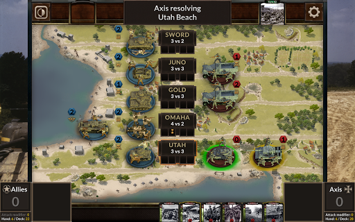 However, the Axis has the starting advantage; the Allies need to avoid being caught dead in the water. Although most units are preassigned to a beach, each game is won or lost by the placement of cards that provide additional forces or support. Not only is the state of each beach important to consider for these decisions, but also the geography of the coastline - after a beach has been won, the victorious forces can flank adjacent beaches. Both players must always be thinking ahead, looking for ways to best utilise their cards down the line.