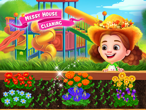 Now head towards to bedroom, put cloth in basket.Use broom to clean floor and window.Go to the garden and remove dirty plants.Use seeds and spray some water to plant a new tree.clean messy bathroom.Turn of the tap.Arrange soap and toys in bathroom to their place, and clean wash basin with brush.Put dirty toilet paper in dustbin.Wash toilet with liquid, rub with cotton and then wash with brush.Empty bathtub and clean it with brush.