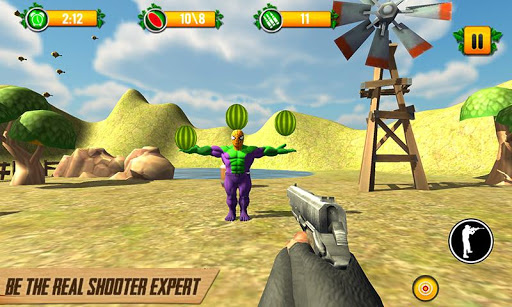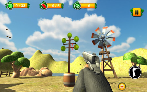 Focus your target and hit only watermelon. Hitting around or other than target can fail you to achieve mission. Hitting other objects is loss of bullets.