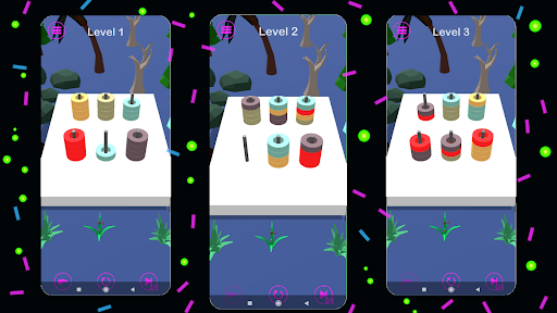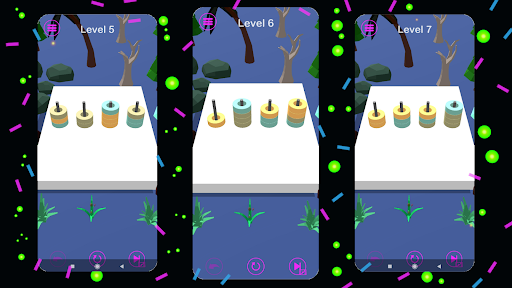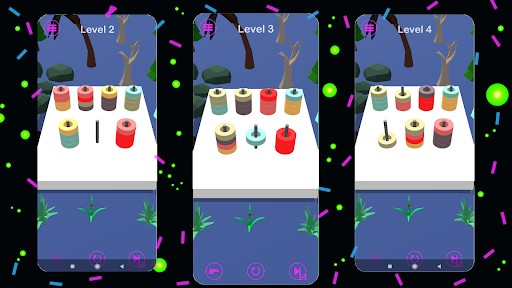Solve the game by sorting colorful hoops. The only rule is that you can only move a hoop on top of another one if both of them have the same color and the hoop stack you want to move into still has enough space.