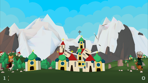 Each player shoots the bow at the field, and every arrow, when it lands, creates a monastery or mosque. After 15 arrows, the player with the church with the cross closest to the sky (highest up) wins, and a new round begins.
