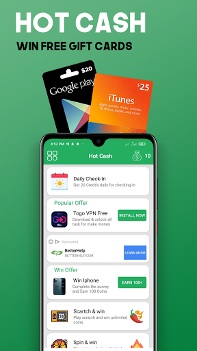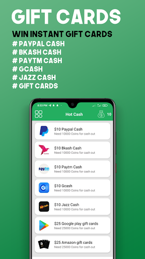 Hot Cash - Get Free Gift Cards & Real Cash you will find a wide variety of rewards, for example google play gift cards, free diamonds for freefire or paypal money and many more.