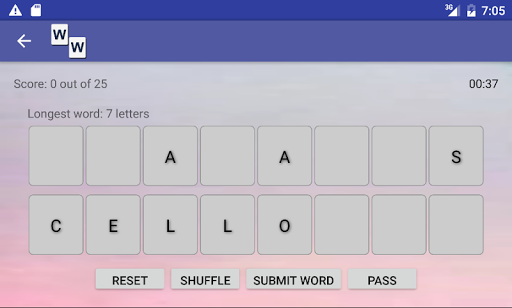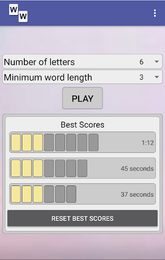 Choose how many letters you want and your minimum word length, and get ready to find your best word. Word Wanda will tell you the length of the longest possible word - you can decide whether to try for the longest, or to race the clock.
