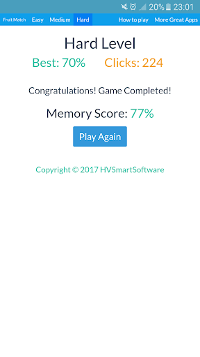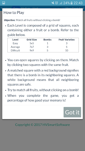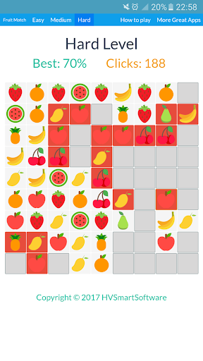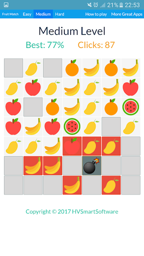 Fruit Match is a fun puzzle memory game with bombs on the grid. Your objective is to open and match the fruits in the grid without hitting a bomb. Upon completion of the game, you are presented with you memory score percentage. This app can help improve your memory as well! Enjoy!