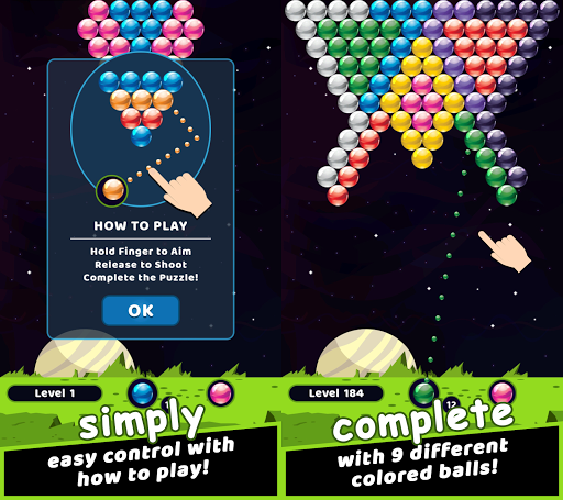- Drag your finger to aim, and lift it to shoot bubbles and pop all the bubbles on the screen by matching 3 colors to clear the missions for every stage along the way.