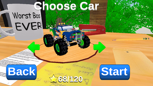 RC Truck Racing 3D is set in a realistic working office environment, race your RC monster truck over and under office utilities and furniture. Climb over piled-up computer, jump over gaps between office desks and explore the environment to collect all 120 hidden star to unlock all of the RC Monster trucks. Race around the office, jump off everything to collect all of the illusive hidden stars and unlock all of the cool trucks.