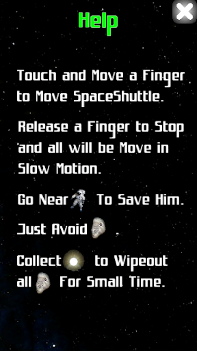 Use the space shuttle to rescue the astronaut floating through space. Avoid colliding with the asteroids and catch the shinning star to wipe-out all the asteroids. Your space shuttle moves respectively as you move your finger.